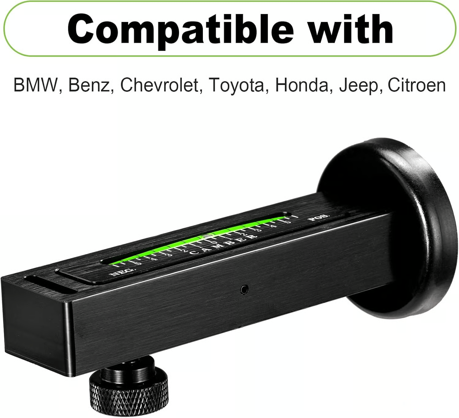 Professional Measurement:Â Camber caster alignment tool has a horizontal adjustment range from -5 to 5 degrees. The large adjustment knob facilitates zeroing the bubble when measuring caster angle.